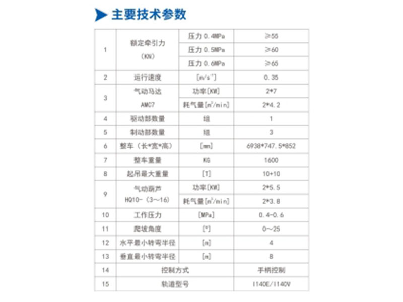 承載小車、連接裝置、氣動葫蘆*2(10噸)等。